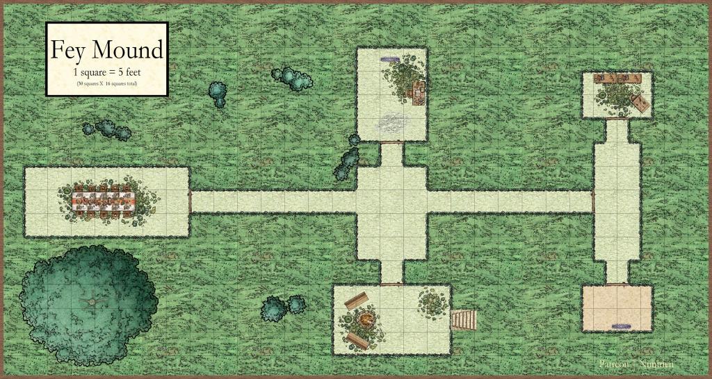 Hey, welcome to my little corner of the rpg world. I’ve been gearing up to write a second adventure in my Oilinane series, and put together a map of a fey mound. The idea is for it to be a kind of mini-dungeon, though instead of regular jungle walls the rooms have trellises with plants growing through them as boundaries.